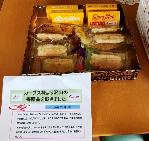 とちぎハウスでも、近くに「カーブススーパーオオタニ自治医大店」がオープンし、壬生中央店と2店舗から2月17日(土)に『フードドライブ』として段ボール60個余りの食料品や日用品などをカーブスのスタッフ6名が運んでくださいました。