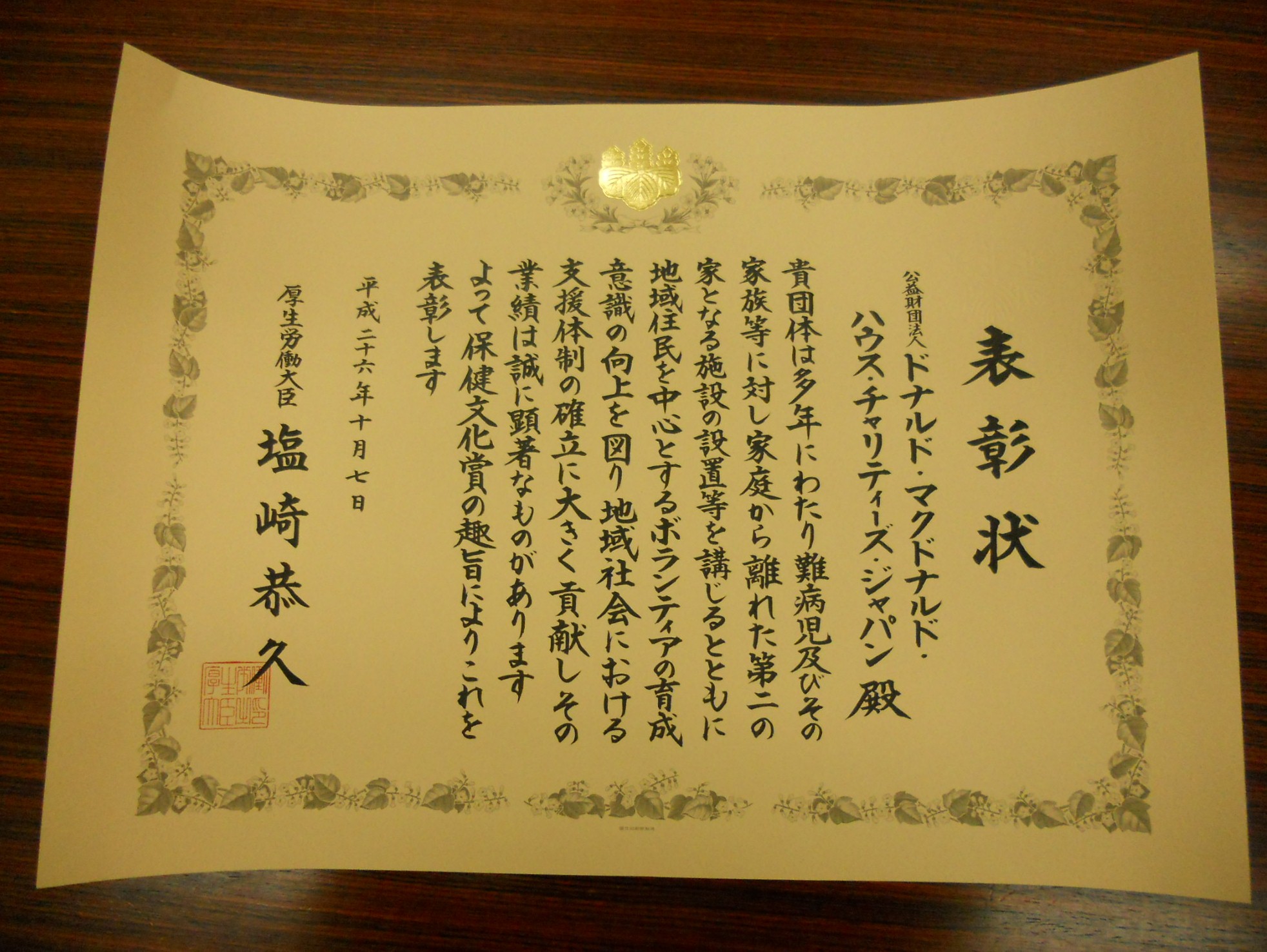 Since its inception in 1950, the Health and Culture Prize has been regarded as a prominent prize honoring groups and individuals that made remarkable achievements in the field of healthcare, such as promoting health and preventing diseases, and health and welfare of the elderly and people with disabilities, as well as measures for the declining birthrate. In the current fiscal year, ten groups and five people won the prize and RMHC Japan has been selected as one of the winners.