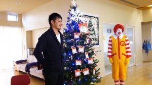 12月23日(月)はクリスマスが近いということで、15名の子ども達そしてハウスの親善大使であるドナルドと共にクリスマスツリーの飾りつけを行いました。子ども達は飾りに願い事や将来の夢を書き、岩隈投手と共に飾り、最後にイルミネーションを点灯!とてもきれいなクリスマスツリーが完成しました。